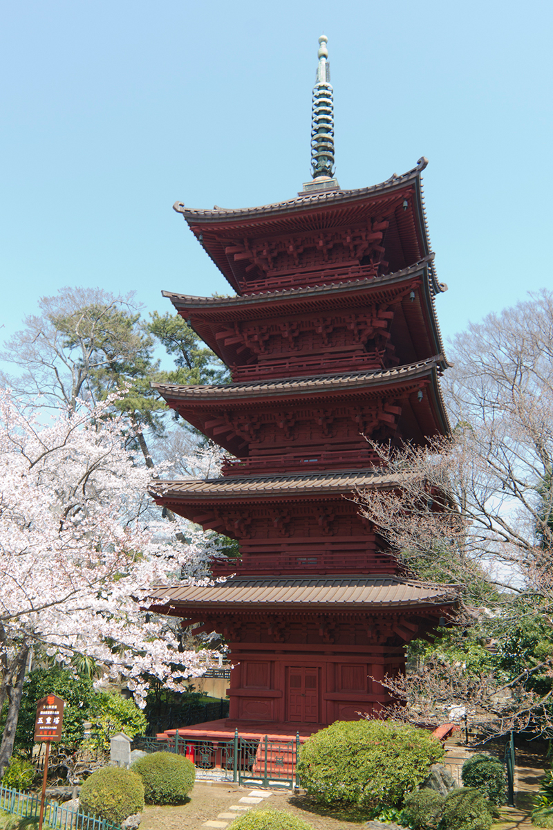 祖师堂外还矗立着一座五重塔。五重塔是一种宝塔建筑结构,源于南亚和东南亚的佛塔。原本供奉着佛祖释迦牟尼的遗骨,象征着佛陀的教义。幕府刀剑鉴定师本阿弥光室(1583-1625),在加贺藩主前田利光(1594-1658)的资助下,为纪念他过世的父母,而建造了法华经寺的五重塔。五重塔高约30米,于1622年完工。1916年,被列为重要文化财产。
