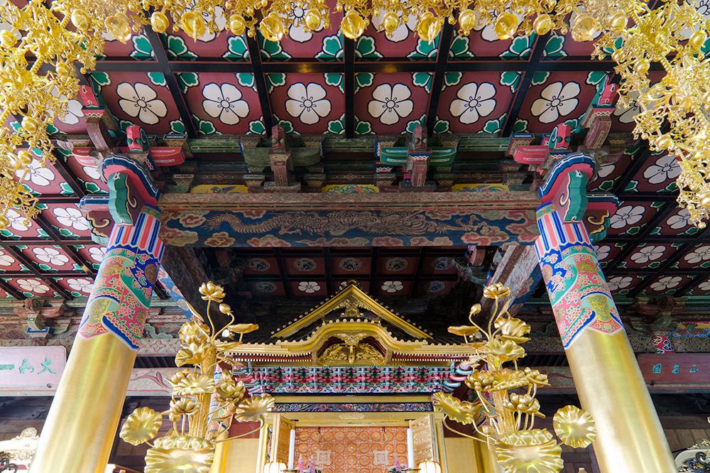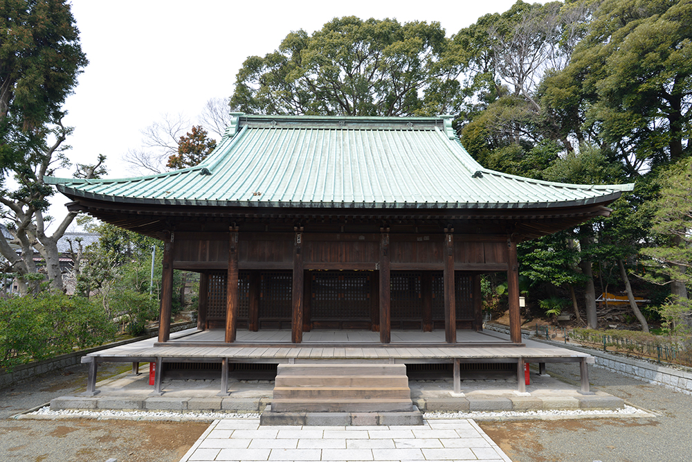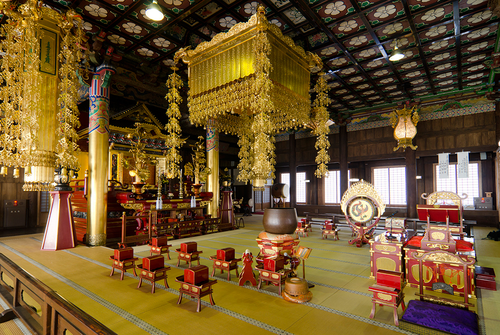 祖师堂内有一座金箔装饰的大祭坛,里面供奉着一尊日莲圣人的塑像。朱红色的花格天花板上,描绘着各种中式的花草图案。祖师堂的大部分外壁都可以打开,从而可以容纳更多的人。每逢圣日,大厅的隔墙还会重新组合,以便迎接大批僧侣聚集于此。祖师堂内外经过了长期修缮,工程于1997年完工,建筑结构下方采用了混凝土地基以防震。