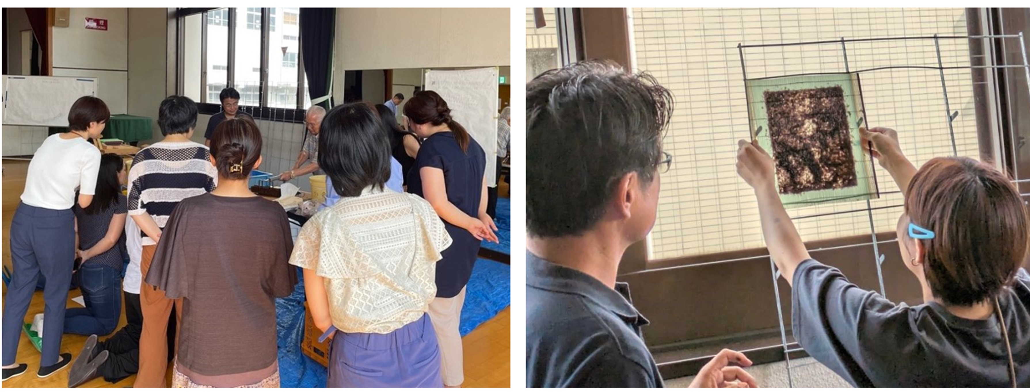 学校でのノリ漉き体験を広めていくため、学校関係者を対象に講習会を開催し、ノリ漉きの作業工程を体験してもらっております。また、講習会後には参加校へのノリ漉き道具の貸し出しを行っております。