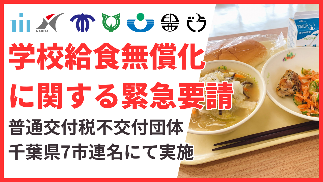 学校給食の無償化に関する制度設計と財源措置について、本市は普通交付税不交付団体である千葉県内6市(成田市、市原市、君津市、浦安市、印西市、袖ケ浦市)と共に連名にて、文部科学省へ緊急要請を行いました。