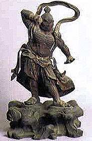 天衣を含めた像高が24.3センチメートル、岩を模した台座からでも31.3センチメートルという小さな吽形(うんぎょう、 口を閉じた形)の二王像ですが、たくましい表情や筋肉、均整のとれた全容、繊細な彫りなど、力強さにあふれた優れた作品です。寄木造で玉眼が入り、全身に彩色が施され、上半身は裸形、下半身の裳には金泥で麻の葉つなぎ文の華麗な文様が描かれています。わずかに腰をひねり、右手には金剛杵(こんごうしょ)を持っていたと思われますが、現在は欠失しています。また、右手首は最近補修したものです。
