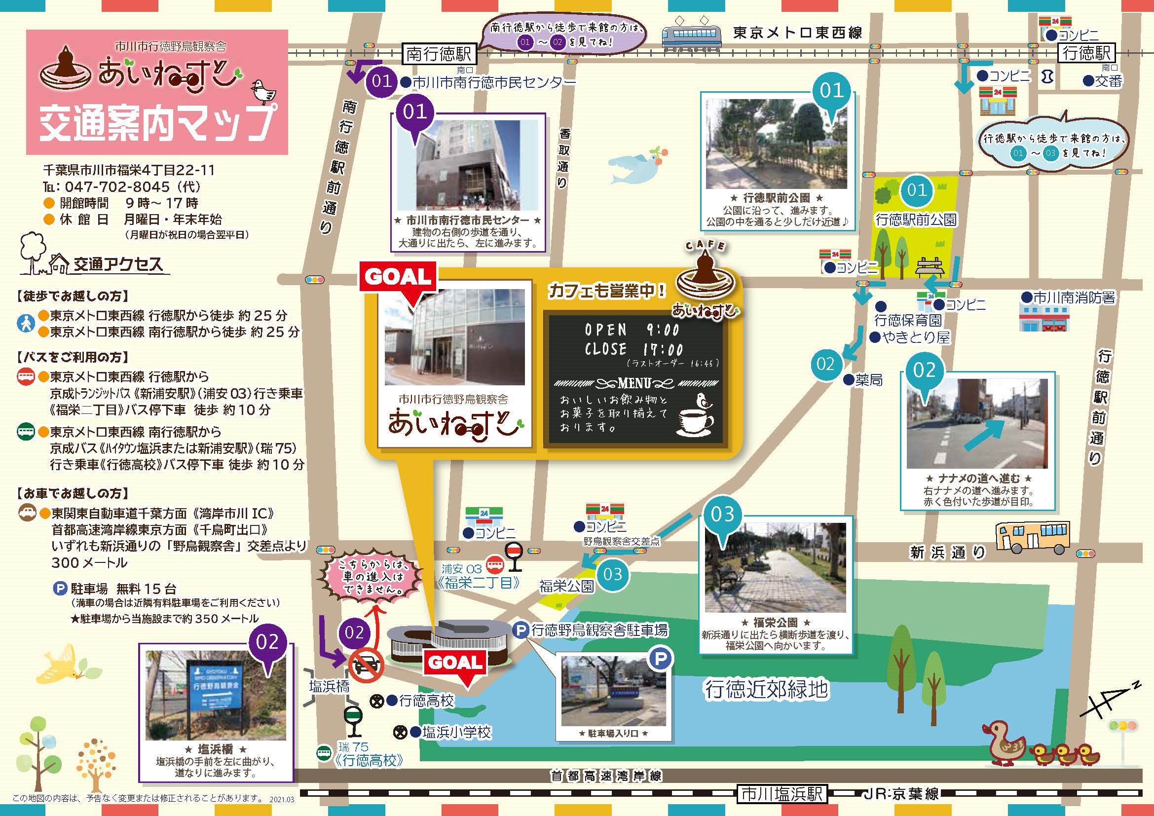 - 新浜通りの野鳥観察舎交差点から進入し、約300メートル先にある行徳野鳥観察舎駐車場に駐車し徒歩でご来館ください。詳しくは、「福栄2丁目バス停からの道のり(PDF) [PDFファイル/262KB]」をクリック