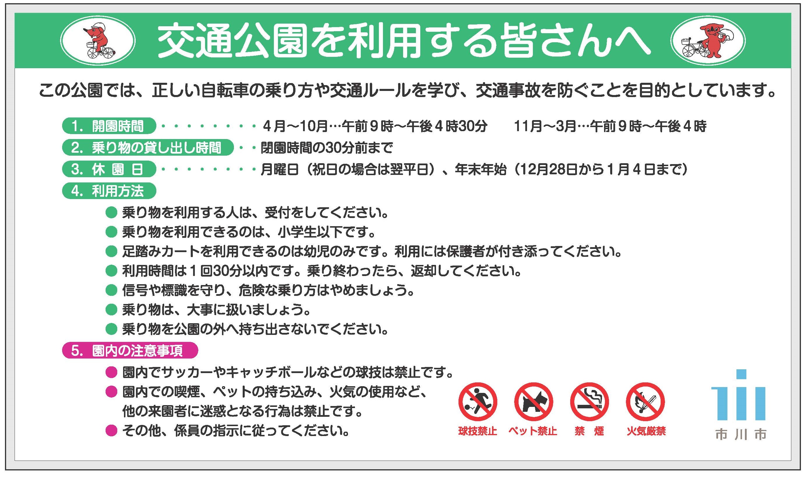 - JR総武線市川駅北口から、市川学園行き、本八幡駅行きバス「交通公園入口」下車徒歩5分