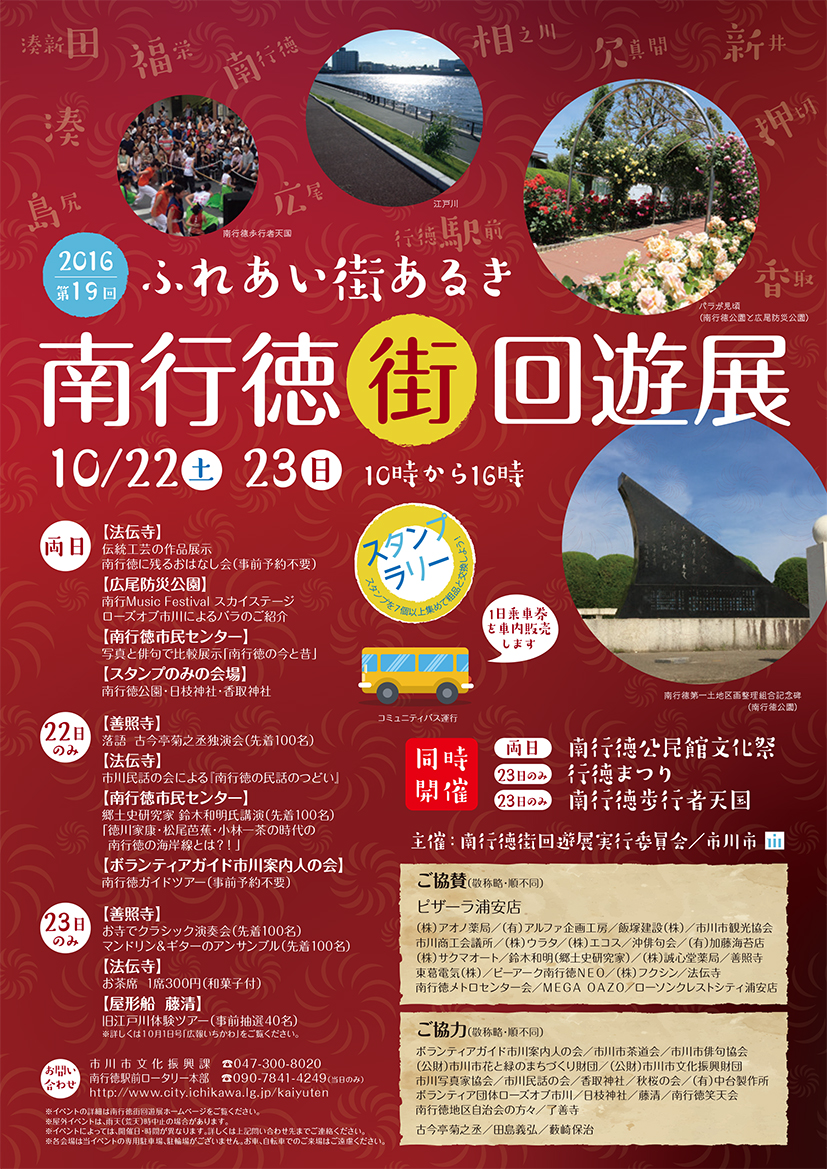 今年度19回目となる街回遊展は平成28年10月22日(土曜日)・23日(日曜日)の2日間、南行徳地区での開催いたします。