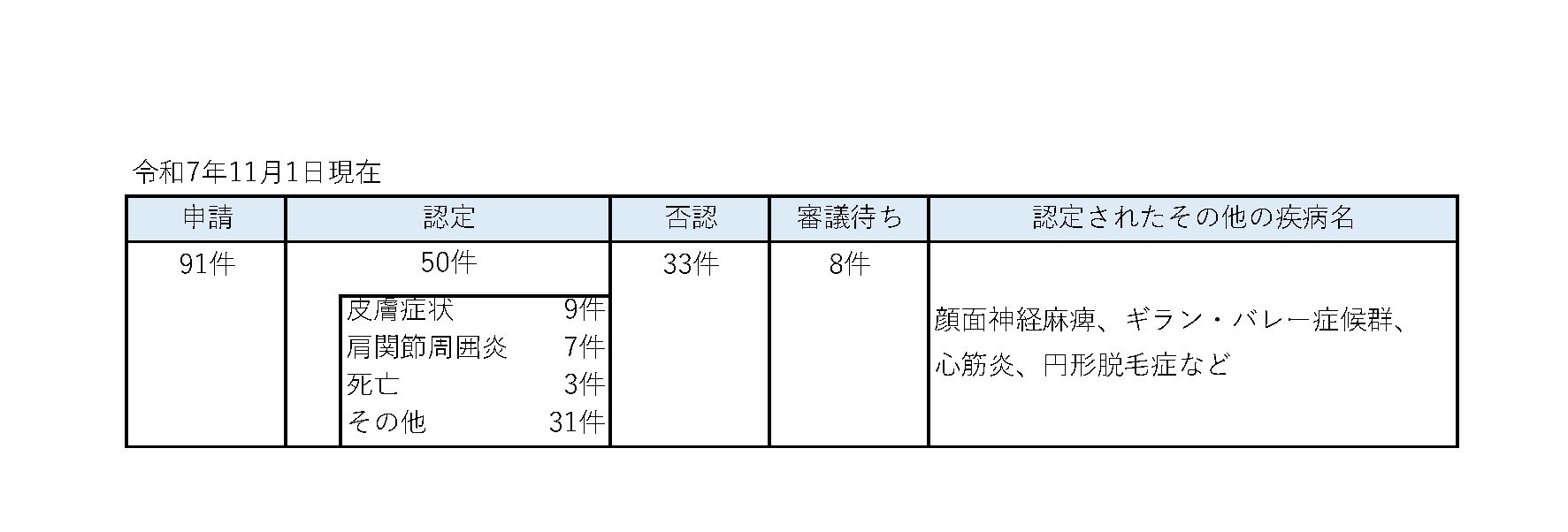 厚生労働省の疾病・障害認定審査会における新型コロナワクチン接種による健康被害救済制度の申請・認定状況が 疾病・障害認定審査会のページで確認できます。