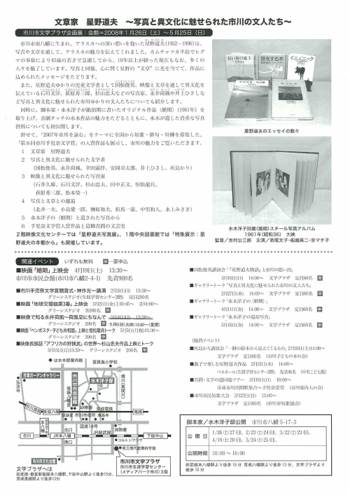 また、星野道夫ゆかりの児童文学者として国松俊英、映像と文章を通して異文化を伝えている石川文洋、萩原秀三郎、杉山忠夫などの写真家、永井荷風や井上ひさしなど写真 と異文化に魅せられた市川ゆかりの文人たちについても紹介します。