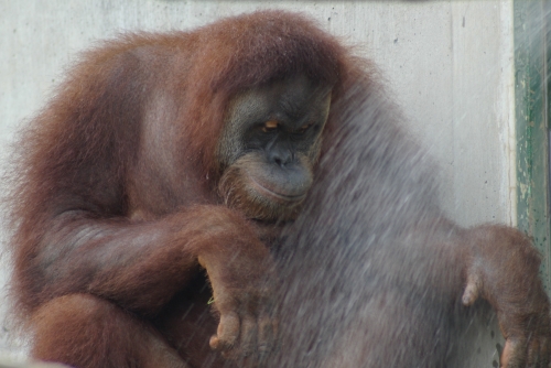 暑いので、オランウータンのリリー(メス)の水遊びを毎日のようにやっています。シャワーやホースで水をかけてあげるのですが、頭からザバーっと浴びれば気持ちよさそうなのに、リリーちゃんは水を口で受け止めるのが一番好きです。むしろ、顔に水がかからないように段ボールなどでガードしていたりします。